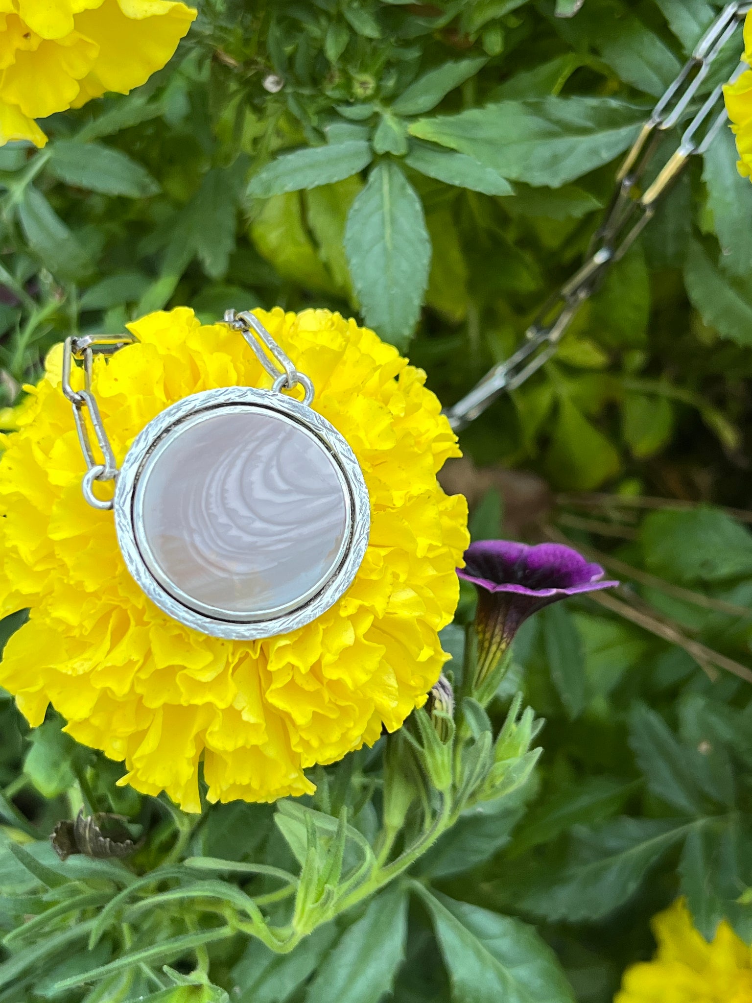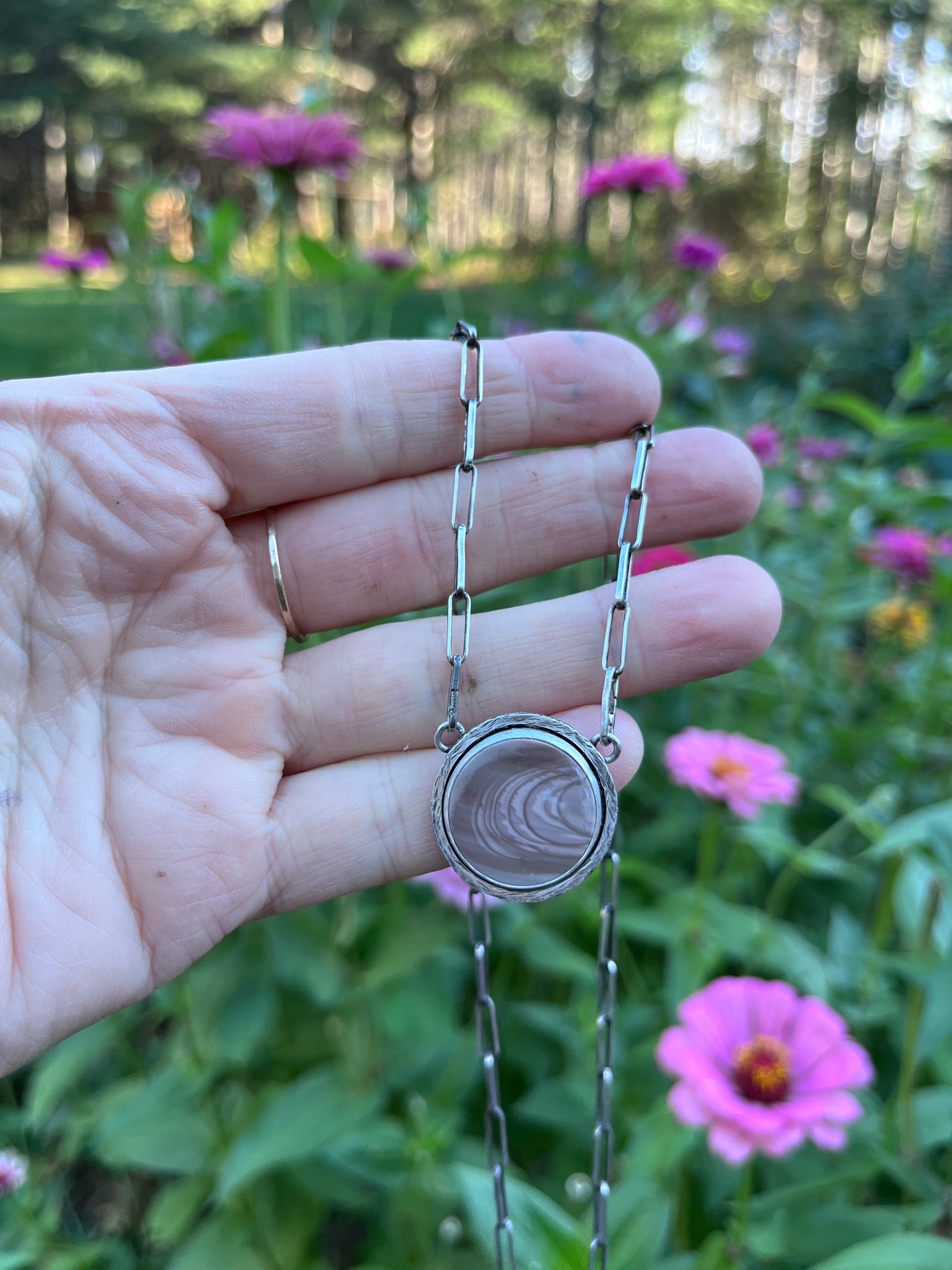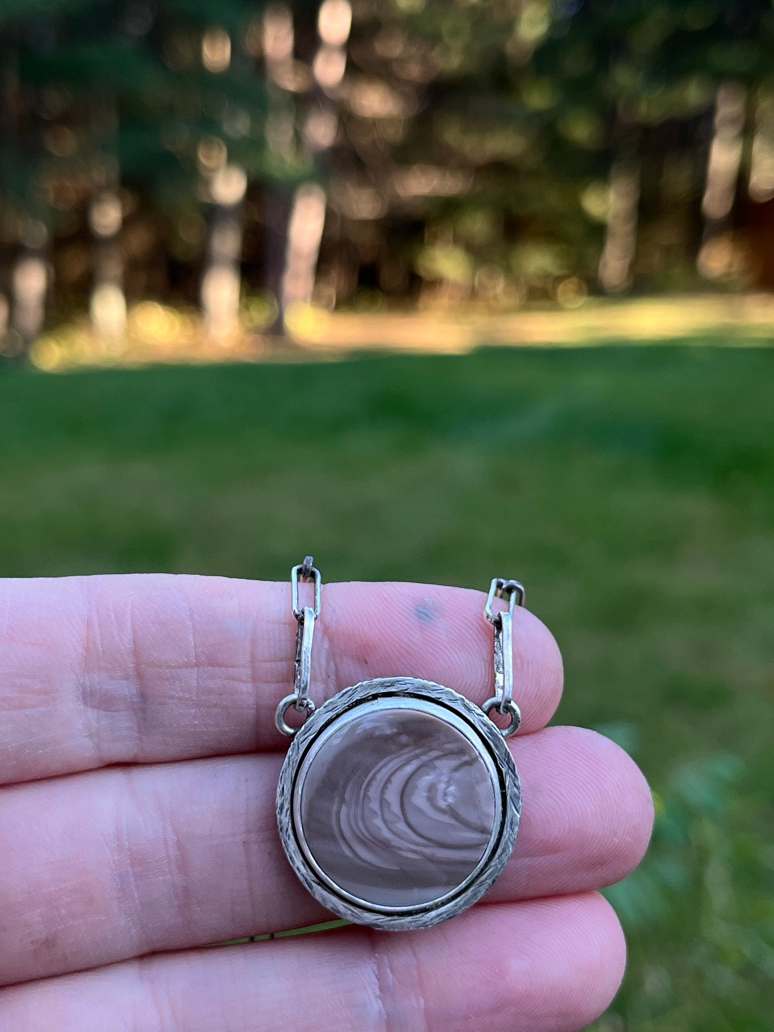 Pendant one of a kind Imperial Jasper, Silver, Etched and Embossed Woodland in silver, Reversible, Elongated silver Cable chain 20” and adjustable. Harvest Moon inspired.