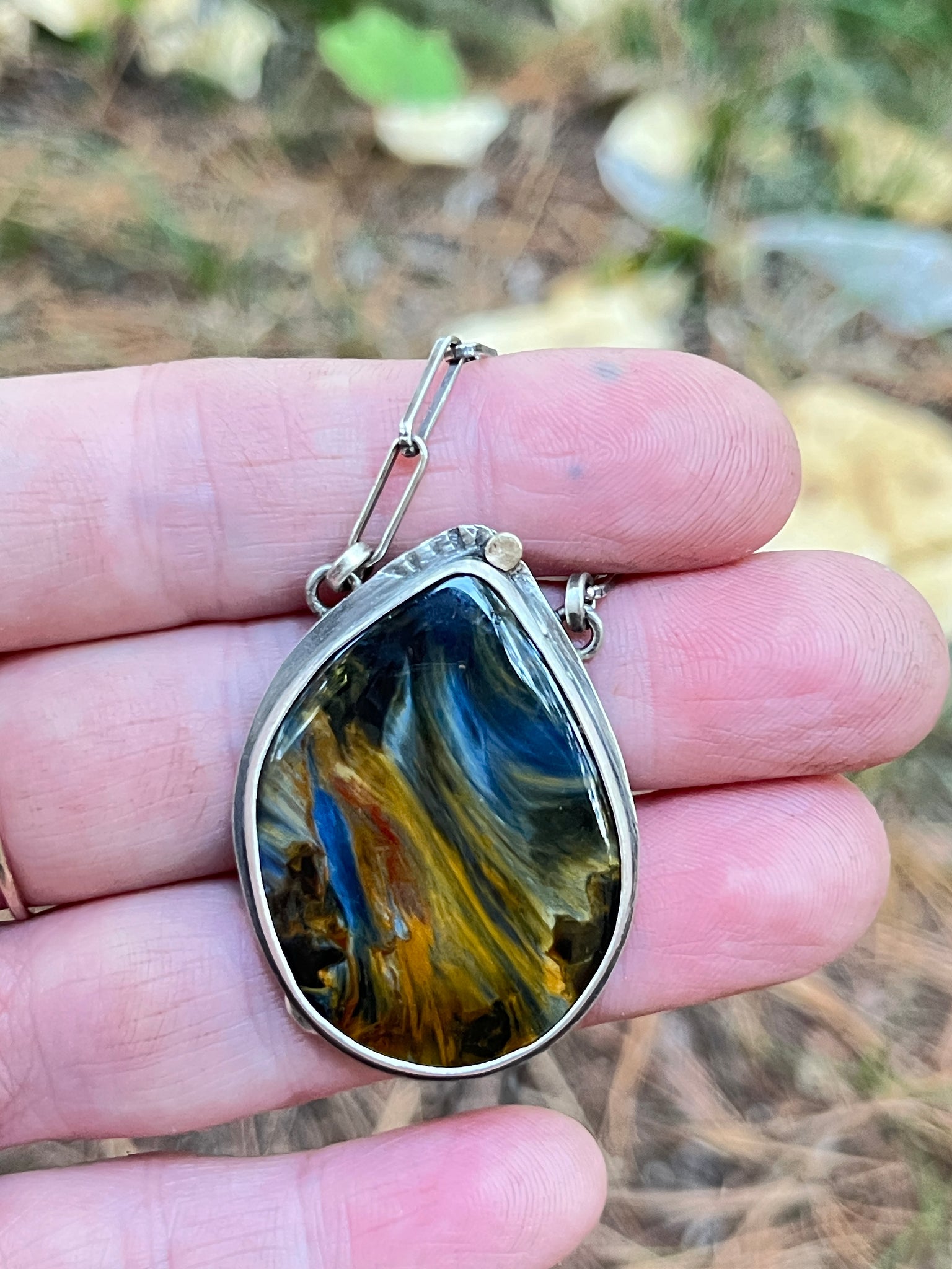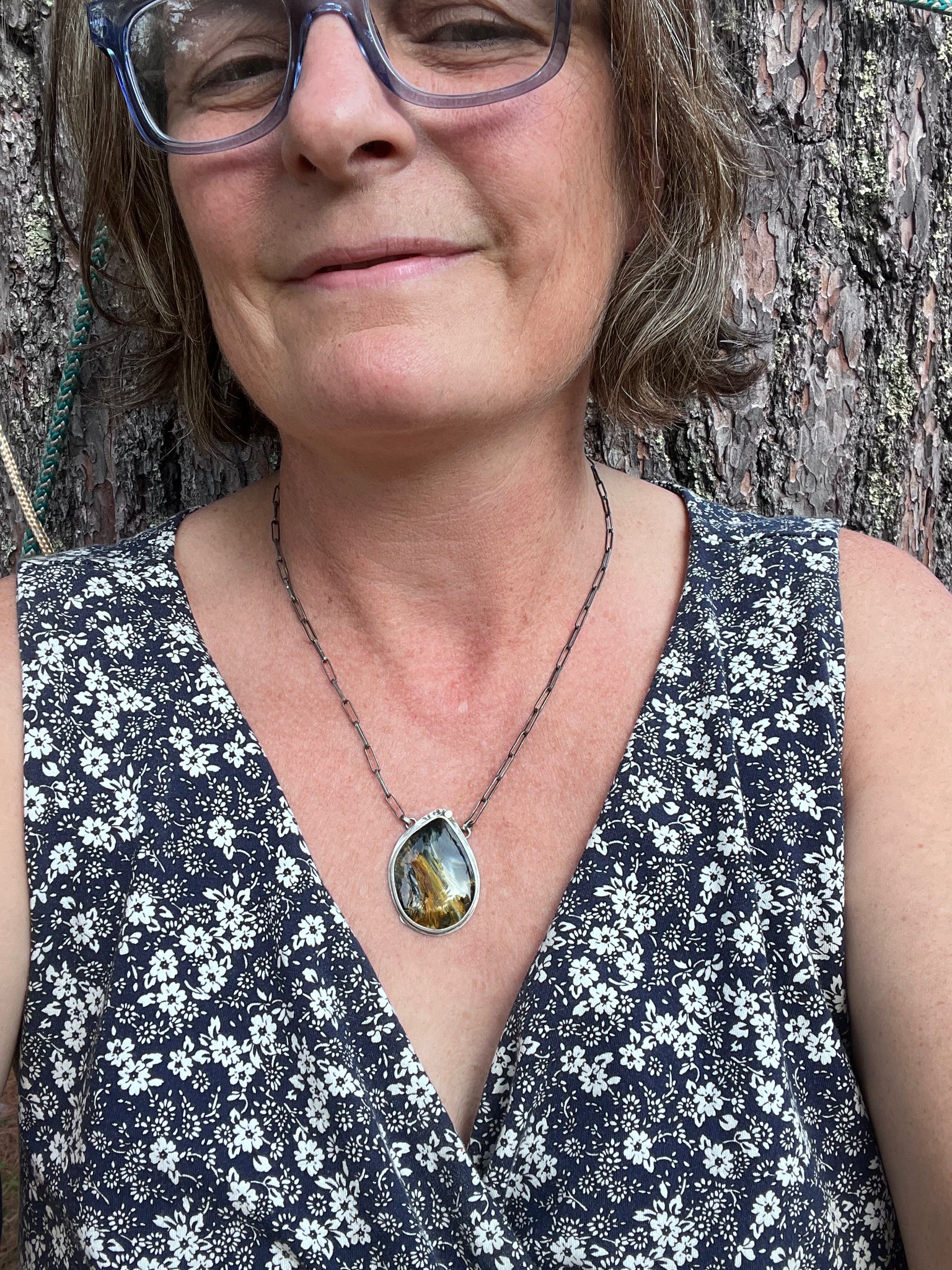 Pendant of Petersite color change gem with flashes of blue, brown, golds, earthy colors. One of a kind pendant and gem set in silver with accents in gold, reversible. 20” adjustable elongated cable silver chain.